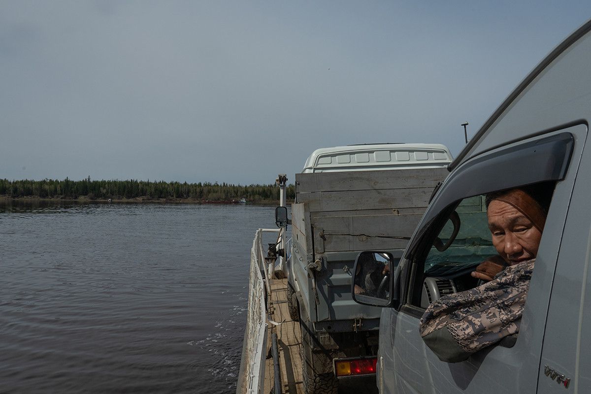 Мы едем к переправе, ведущей в село Сюльдюкар, что в переводе с эвенкийского означает «дух земли». Это единственное в Мирнинском районе место компактного проживания эвенков, куда летом можно попасть только на лодке и с теми, у кого есть сельская прописка — ее проверяют на посту охраны Светлинской ГЭС, стоящей на реке Вилюй.