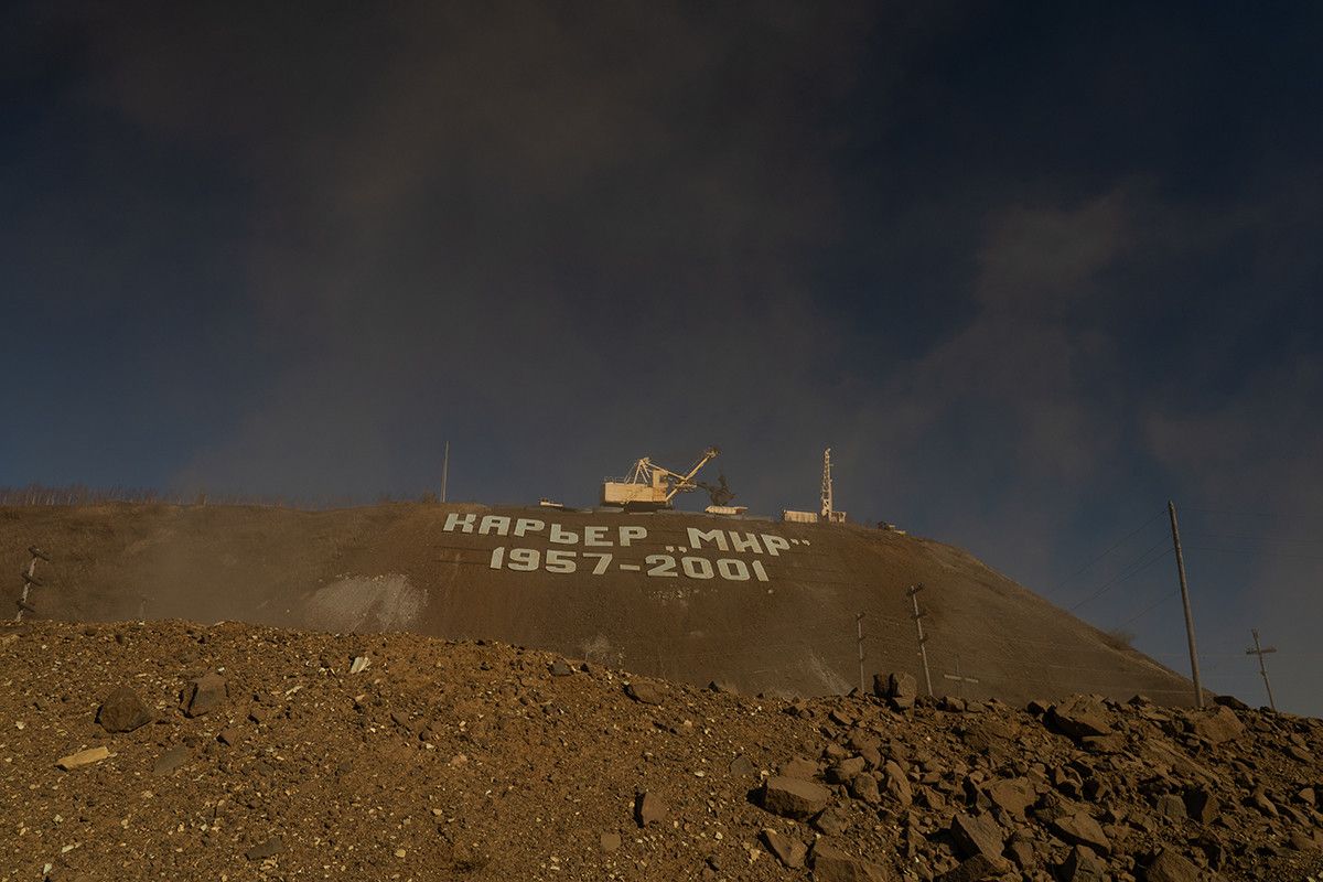 На востоке города — серые рукотворные сопки без единого ростка. Это отвалы вскрышных пород. С рудника «Интернациональный», что находится в 15 км от Мирного, через город курсируют ничем не прикрытые большегрузы с рудой — они возят сырье на обогатительную фабрику № 3. На дорогах, в домах и в воздухе — пыльная взвесь, оседающая в носоглотке.