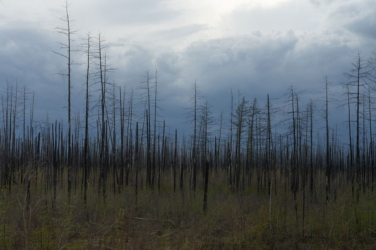 На всем отрезке пути от Мирного до Сюльдюкара — гектары обугленных палок, что когда-то были лесами. Раненой огнем тайги так много, что между чернотой становится непривычно и радостно видеть зеленые поросли. Вдоль реки на холмах, между черными островками, тут и там встречаются проплешины голой горной породы.
